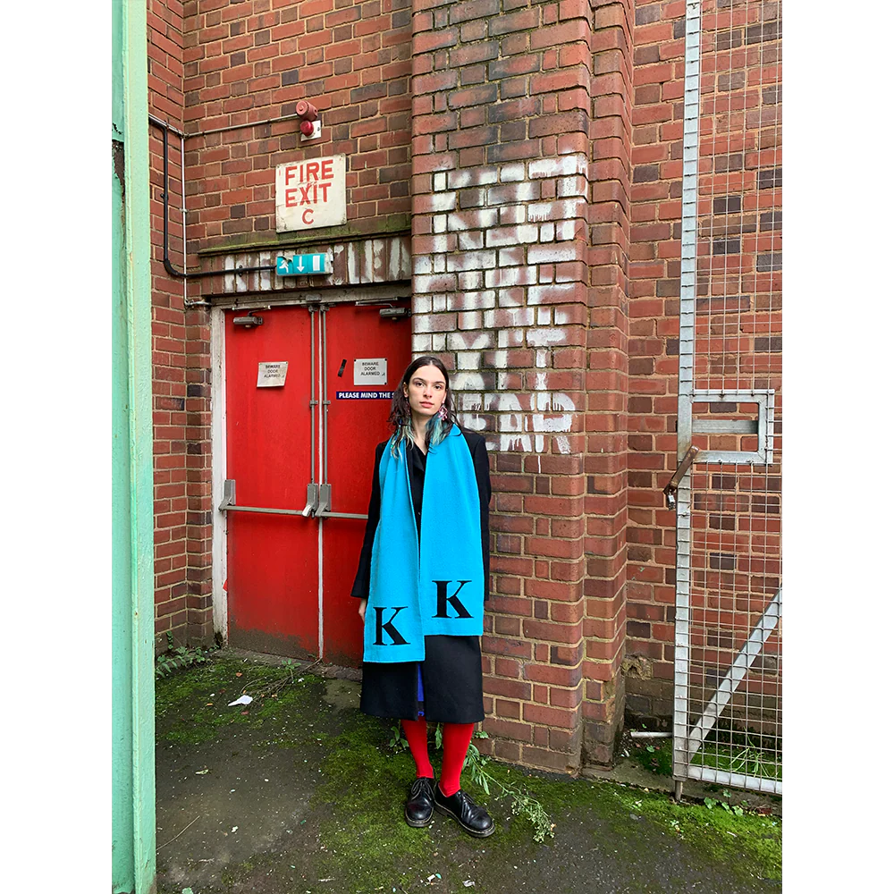 The turquoise and navy K macro double scarf from the Alphabet collection is made from pure lambswool.