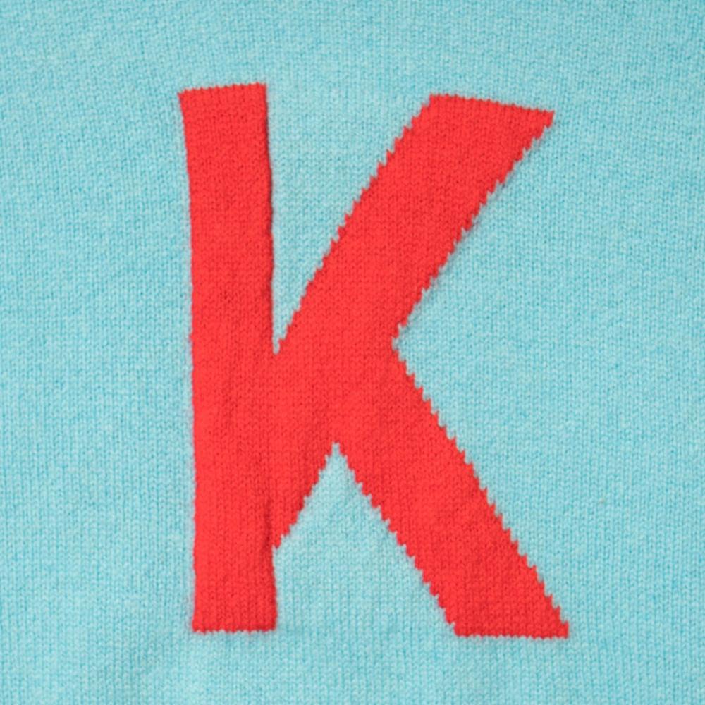 The turquoise and red K knit from the Alphabet collection is made from pure lambswool.