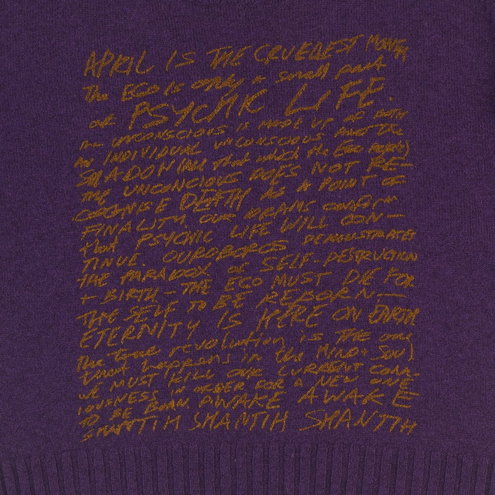 The Eternity jumper crafted in plum lambswool. Knitted in Scotland the pieces incorporate a manifesto text that is screen printed by hand with honey orange ink. The Eternity knits take influence from the teachings of psychoanalyst and prophet Carl Jung.