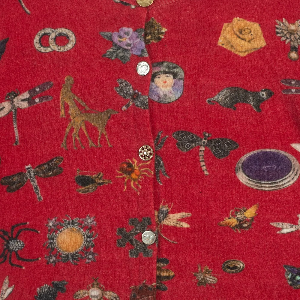 The crimson Guinevere Cardigan. Knitted in a fine gauge 100% lambswool in Spain the cardigan is an open jewellery box, playing with scale and shapes to create a visual abstract composition of idiosyncratic brooch styles and trends.